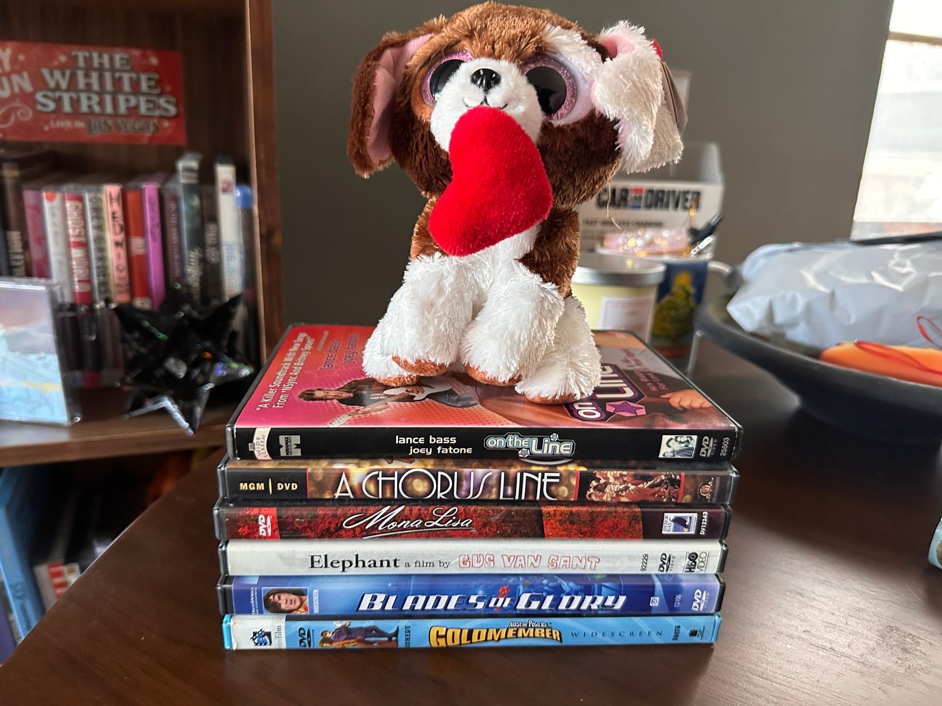 Back to Booth’s Corner! I hit up the dollar DVD guy again and added a stack of discs and a new plush friend to the collection, pictured below. I really appreciate that the dollar DVD guy rotates his stock to feature holiday-based little stuffed animals. Happy Valentine’s Day!