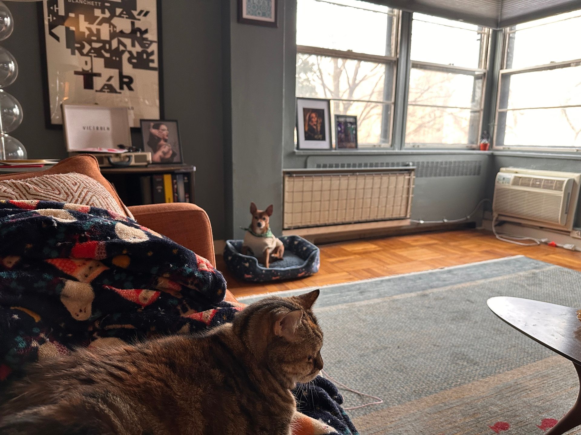 My house guest, Chutney. My parents are out of town, and I’m taking care of their cat. She is a mature lady with one eye who prefers not to travel. The five minute drive from their house to mine was…tense. But she’s settled in and is being carefully monitored by my dog, Little Edie.