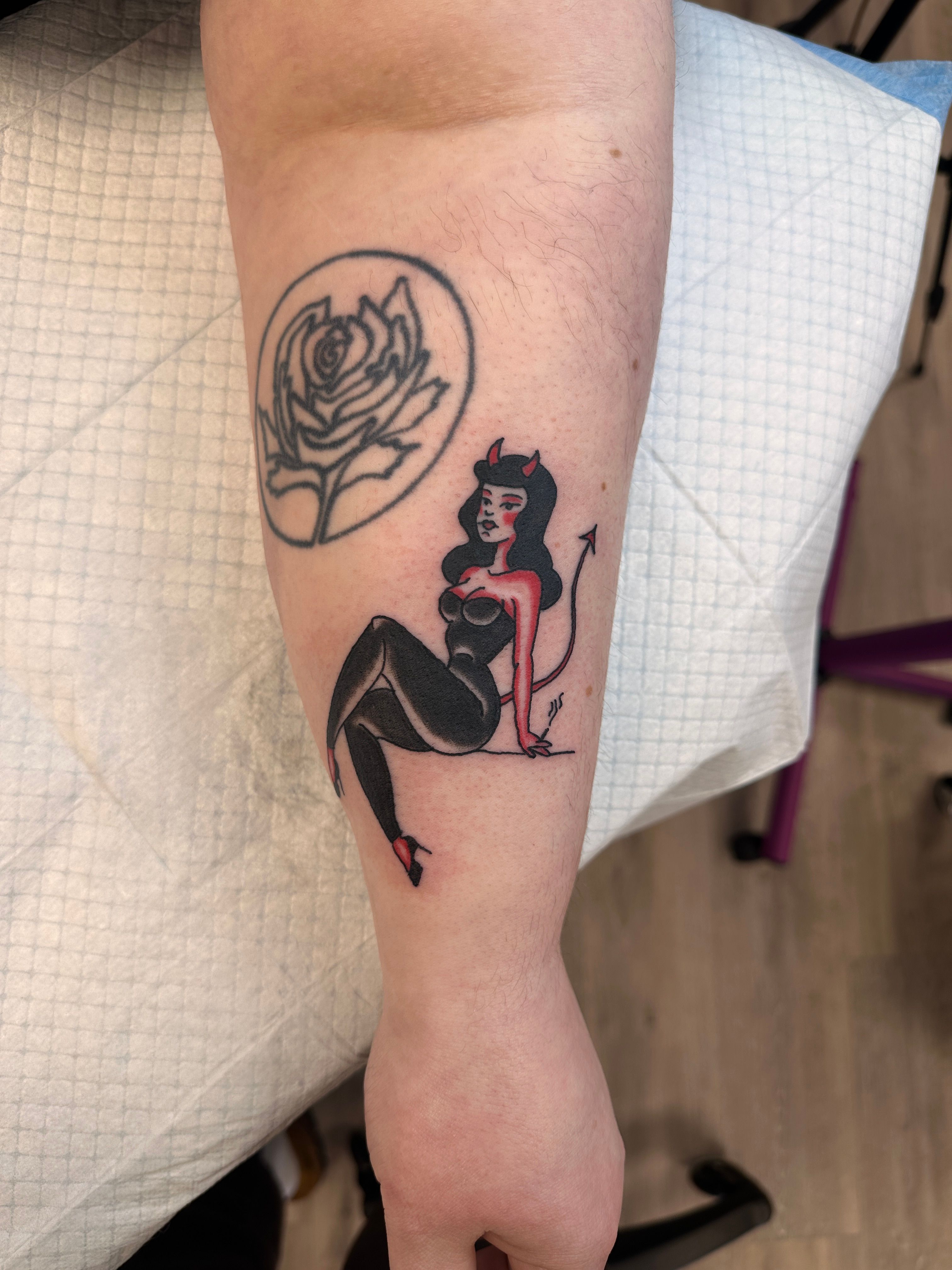 A new tattoo! I haven’t gotten tattooed in years, and I’ve had the itch for a while. Now that I’ve done it, we are so back. I want a thousand more. Stupid ones, beautiful ones, meaningful ones, fun ones. I love my little devil gal from Em at DeKaying Tattoos!